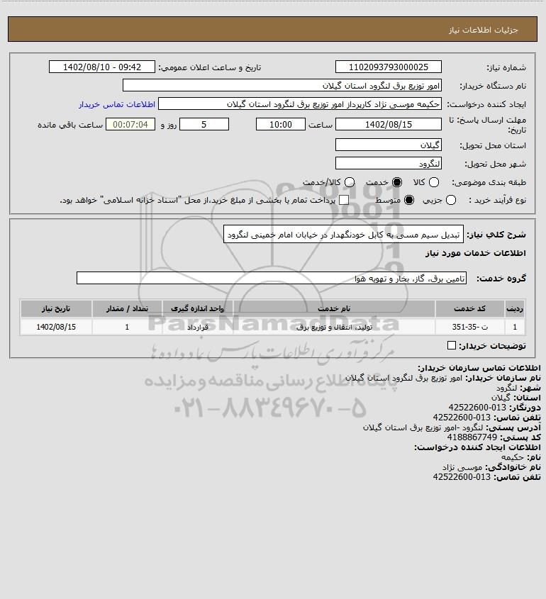 شرح کلی نیاز: تبدیل سیم مسی به کابل خودنگهدار در خیابان امام خمینی لنگرود
