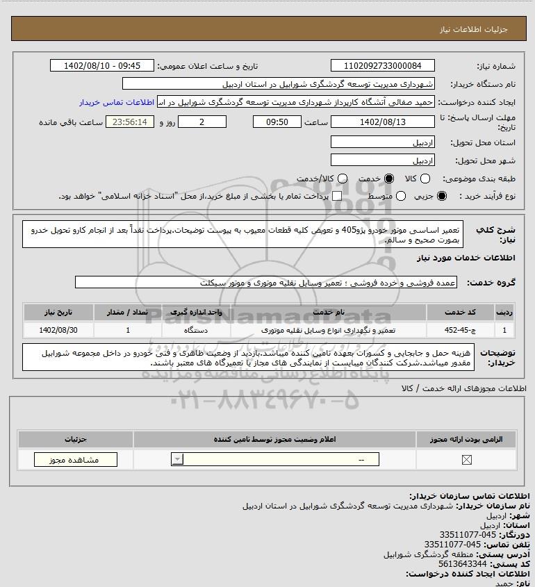 استعلام تعمیر اساسی موتور خودرو پژو405 و تعویض کلیه قطعات معیوب به پیوست توضیحات.پرداخت نقداً بعد از انجام کارو تحویل خدرو بصورت صحیح و سالم., استعلام تعمیر اساسی موتور خودرو پژو405 و تعویض کلیه قطعات معیوب به پیوست توضیحات.پرداخت نقداً بعد از انجام کارو تحویل خدرو بصورت صحیح و سالم.