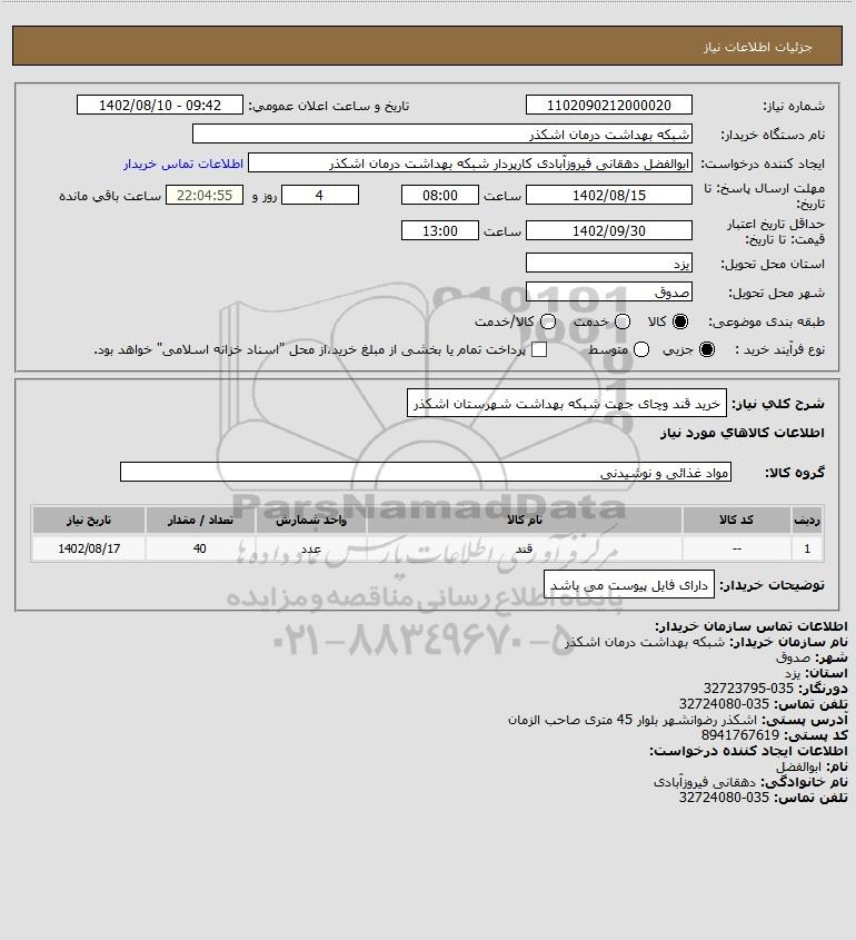 شرح کلی نیاز: خرید قند وچای جهت شبکه بهداشت شهرستان اشکذر