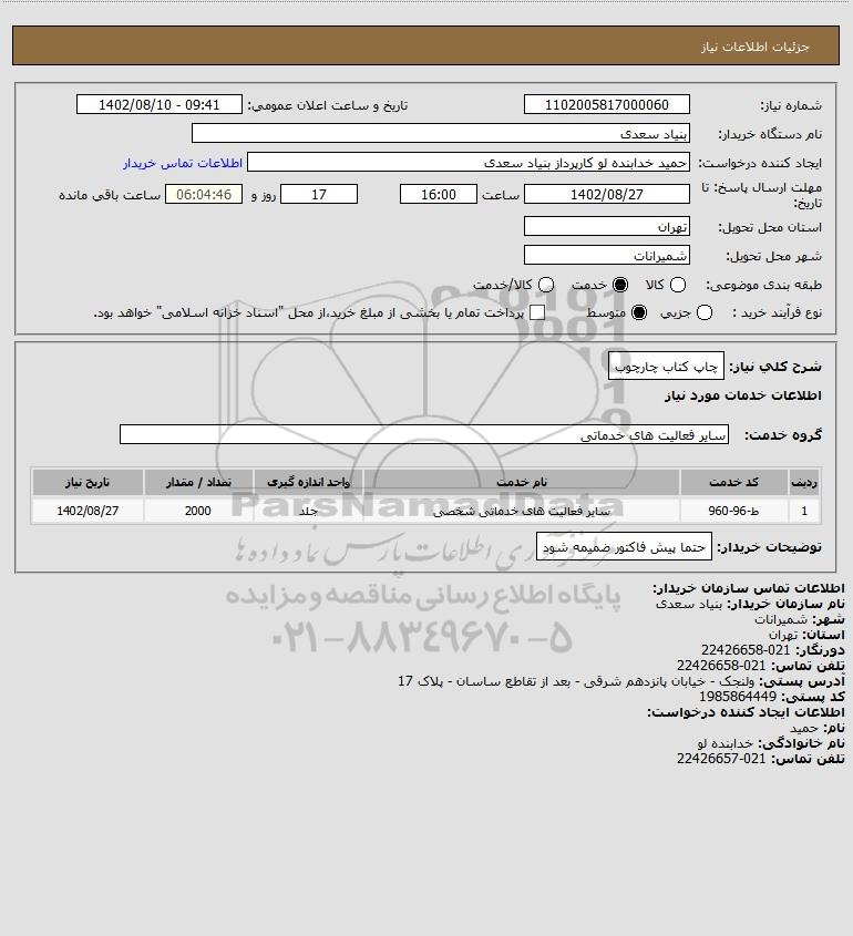 شرح کلی نیاز: چاپ کتاب چارچوب