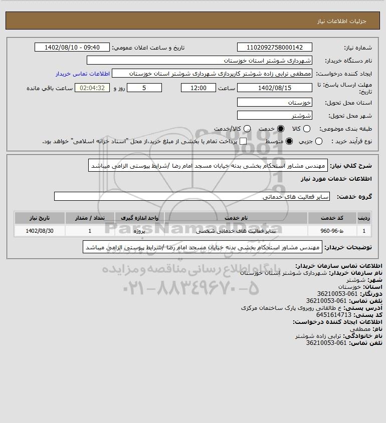 شرح کلی نیاز: مهندس مشاور استحکام بخشی بدنه خیابان مسجد امام رضا /شرایط پیوستی الزامی میباشد