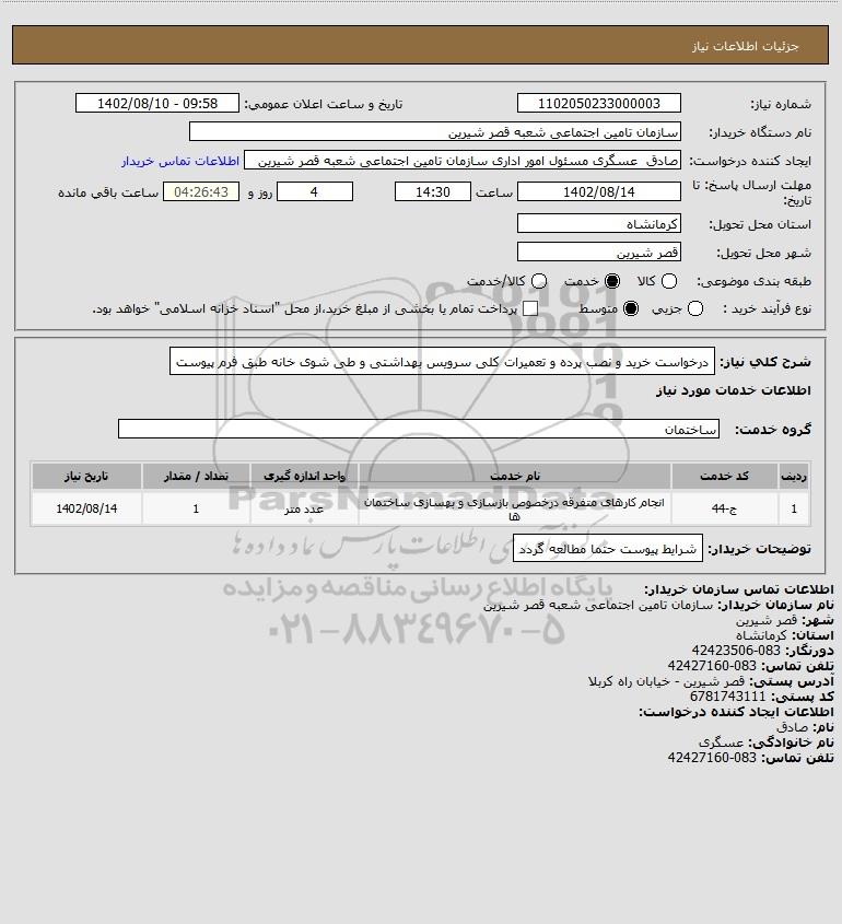 شرح کلی نیاز: درخواست خرید و نصب پرده و تعمیرات کلی سرویس بهداشتی و طی شوی خانه طبق فرم پیوست