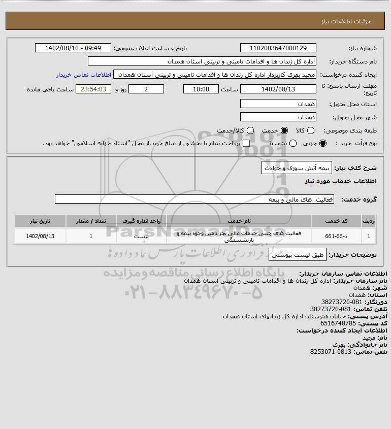شرح کلی نیاز: بیمه آتش سوزی و حوادث