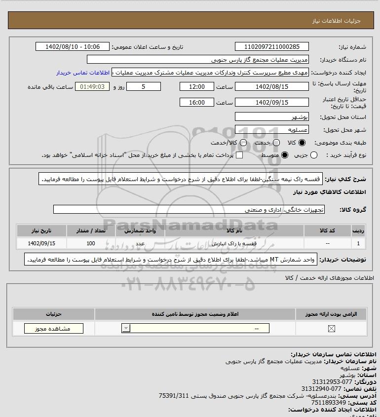 نام سازمان خریدار: مدیریت عملیات مجتمع گاز پارس جنوبی
