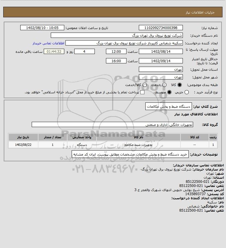 | 1 | -- | تجهیزات ضبط مکالمه | دستگاه | 1 | 1402/08/22 |