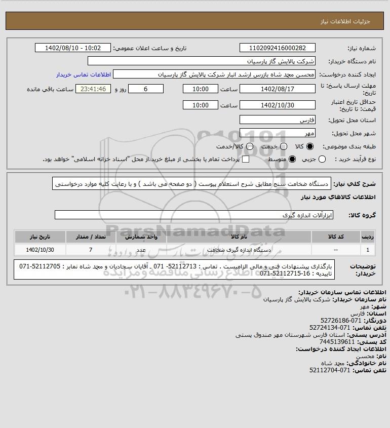 نام دستگاه خریدار:شرکت پالایش گاز پارسیان
