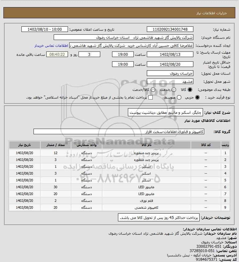 | 7 | -- | مانیتور LED | دستگاه | 20 | 1402/08/20 |