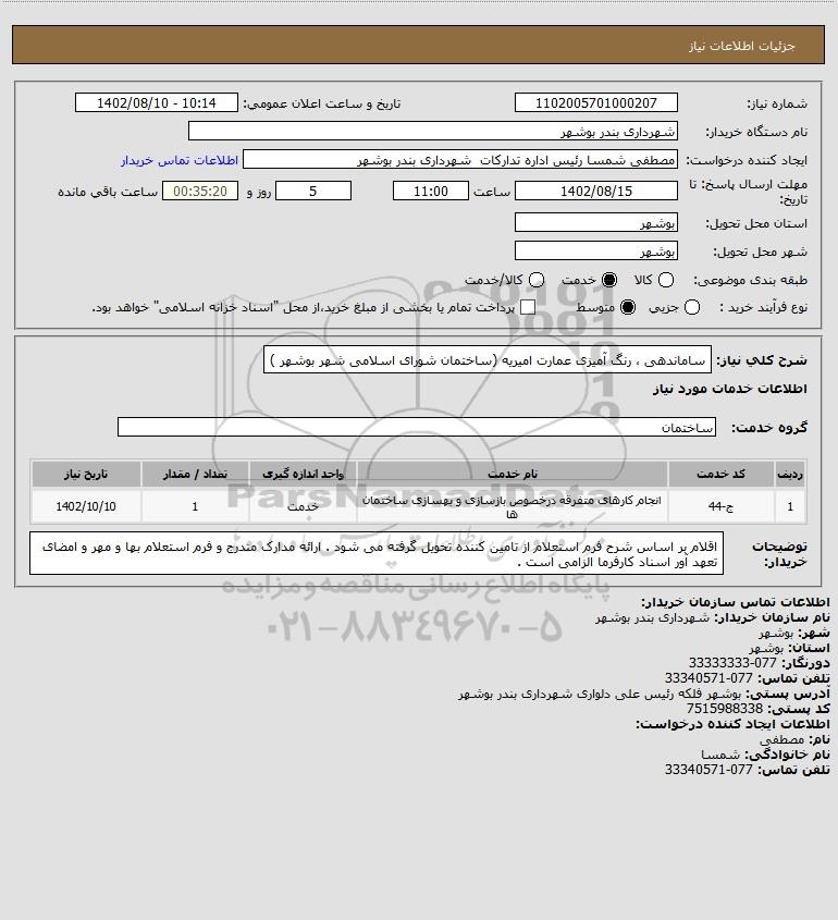 شرح کلی نیاز: ساماندهی ، رنگ آمیزی عمارت امیریه (ساختمان شورای اسلامی شهر بوشهر )