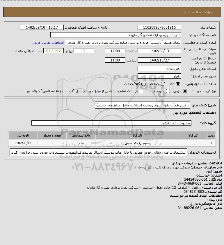 شرح کلی نیاز: باکس ضدآب طبق شرح پیوست (ساخت داخل مدنظرمی باشد)