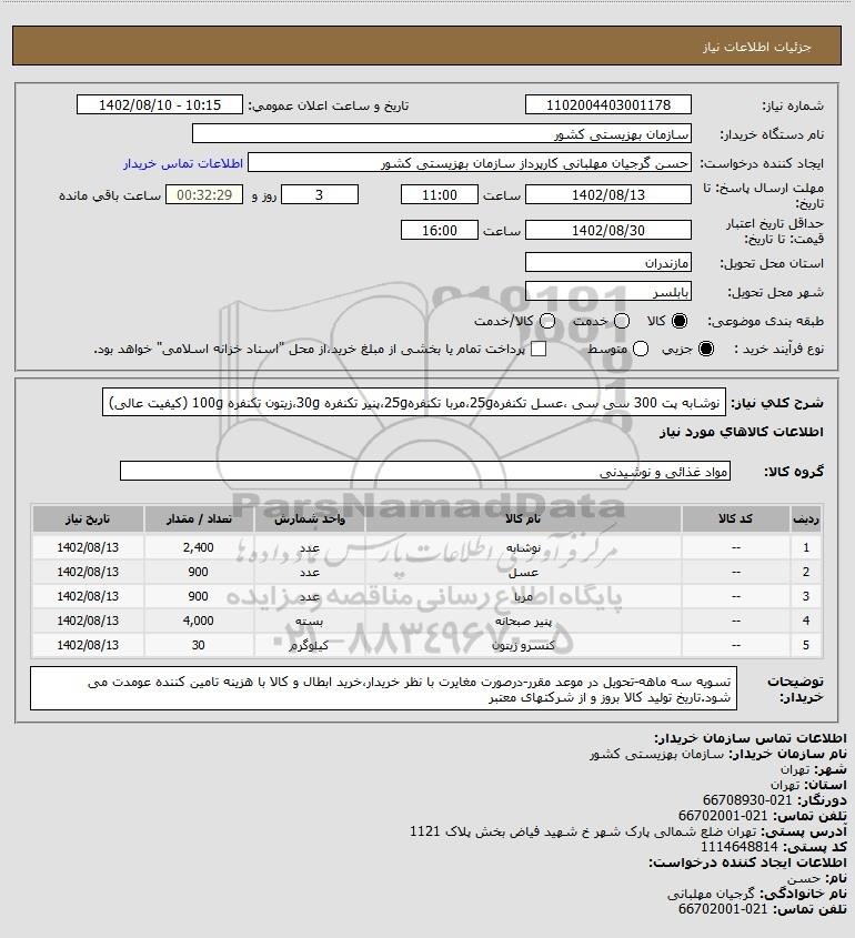 | 5 | -- | کنسرو زیتون | کیلوگرم | 30 | 1402/08/13 |