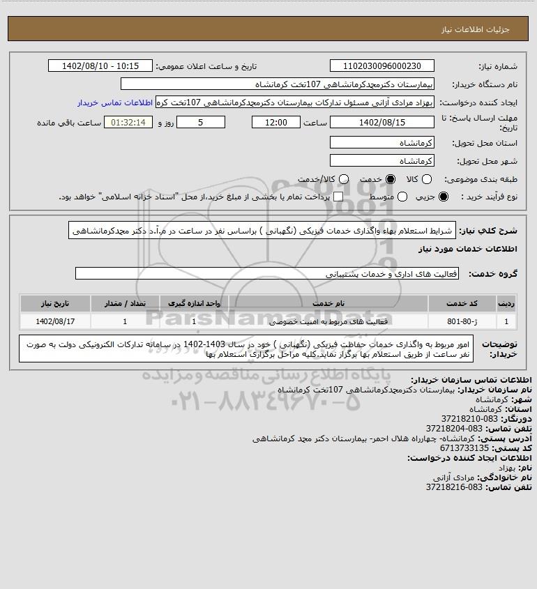 شرح کلی نیاز: شرایط استعلام بهاء واگذاری خدمات فیزیکی (نگهبانی ) براساس نفر در ساعت در م.آ.د دکتر محمدکرمانشاهی