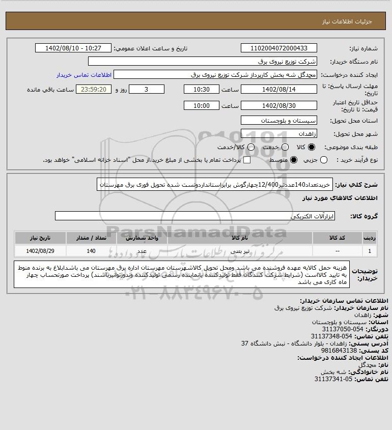 شرح کلی نیاز: خریدتعداد140عددتیر12/400چهارگوش برابراستانداردوتست شده تحویل فوری برق مهرستان
