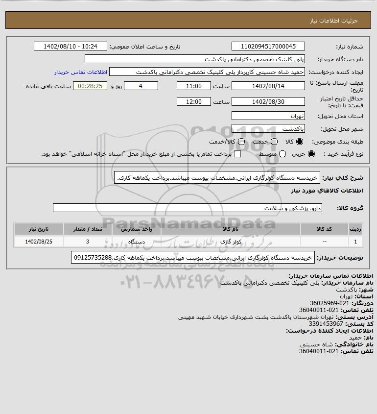 نام دستگاه خریدار:پلی کلینیک تخصصی دکترامانی پاکدشت