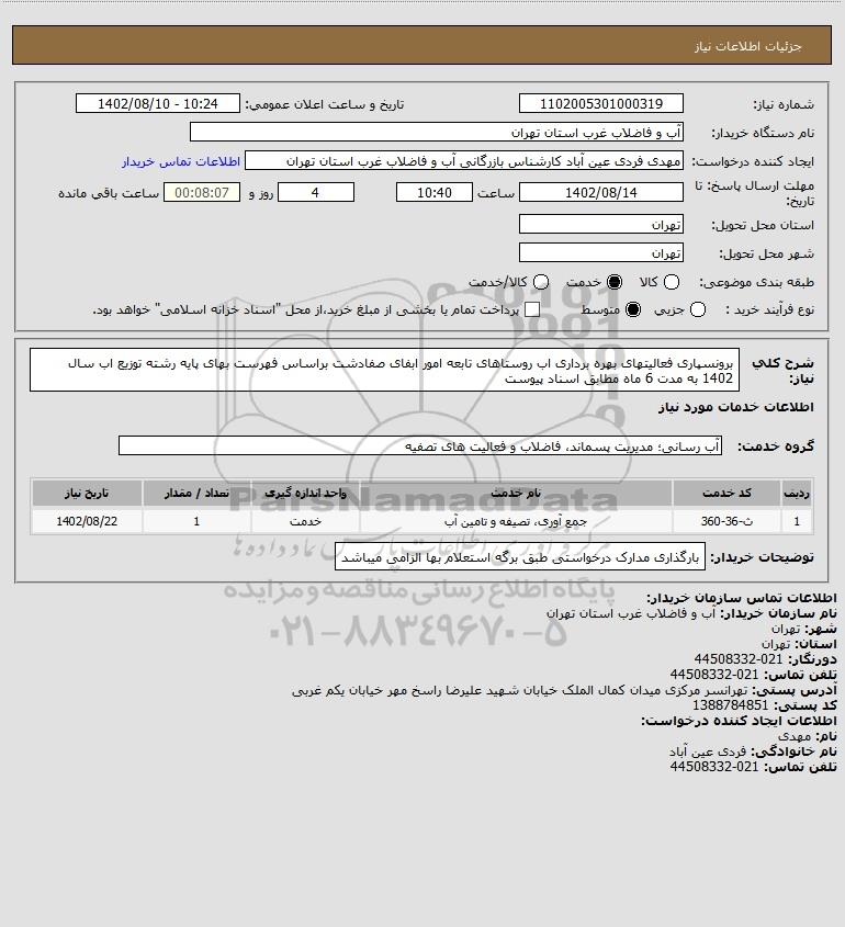 نام سازمان خریدار: آب و فاضلاب غرب استان تهران