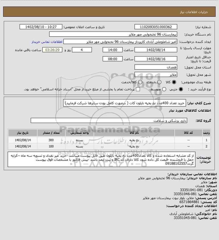 استعلام خرید تعداد 400عدد نخ بخیه نایلون کات ( درصورت کامل بودن سایزها شرکت فرمایید), استعلام خرید تعداد 400عدد نخ بخیه نایلون کات ( درصورت کامل بودن سایزها شرکت فرمایید)