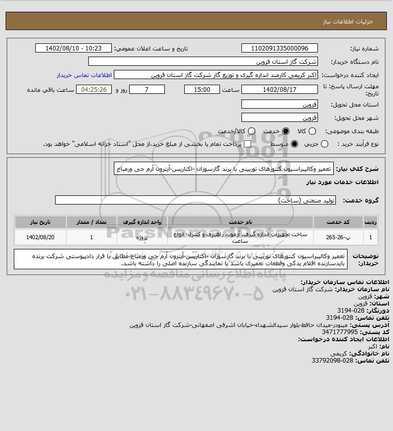 شرح کلی نیاز: تعمیر وکالیبراسیون کنتورهای توربینی با برند گازسوزان -اکتاریس-آیترون آرم جی ورمباخ