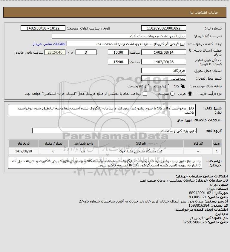 شرح کلی نیاز: فایل درخواست 2قلم کالا با شرح برندو تعدا مورد نیاز درسامانه بارگزاری شده است.حتما پاسخ نیازطبق شرح درخواست باشد.