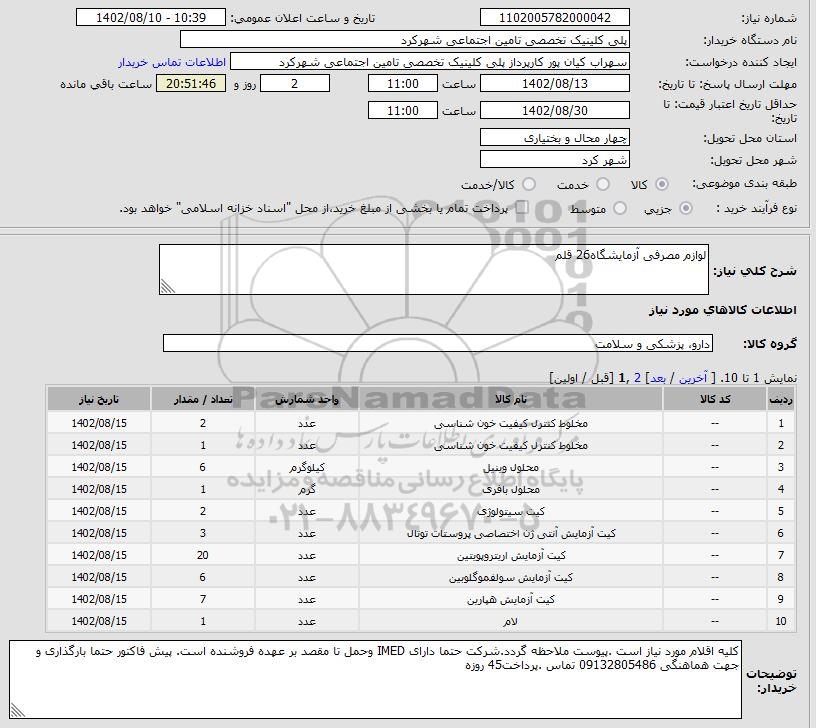 نام دستگاه خریدار:پلی کلینیک تخصصی تامین اجتماعی شهرکرد