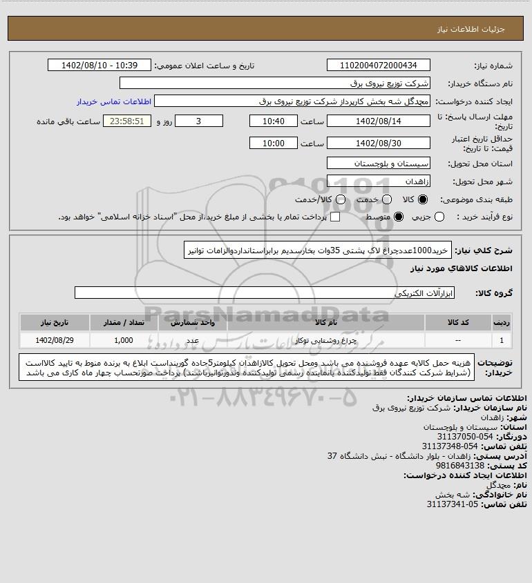شرح کلی نیاز: خرید1000عددچراغ لاک پشتی 35وات بخارسدیم برابراستانداردوالزامات توانیر