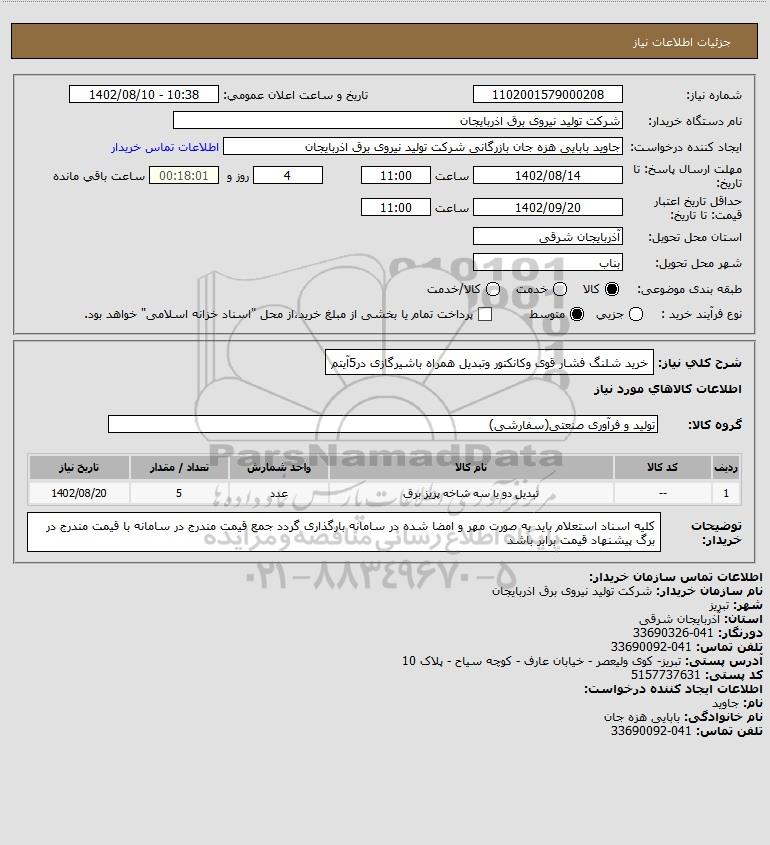 شرح کلی نیاز: خرید شلنگ فشار قوی وکانکتور وتبدیل همراه باشیرگازی در5آیتم