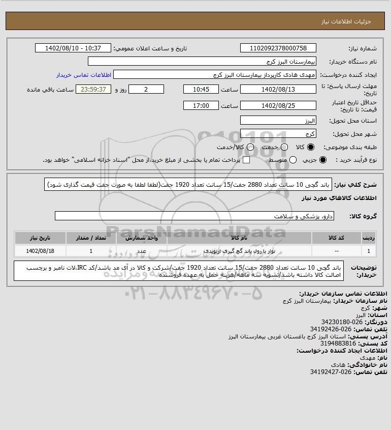 استعلام باند گچی 10 سانت تعداد 2880 جفت/15 سانت تعداد 1920 جفت(لطفا لطفا به صورت جفت قیمت گذاری شود), استعلام باند گچی 10 سانت تعداد 2880 جفت/15 سانت تعداد 1920 جفت(لطفا لطفا به صورت جفت قیمت گذاری شود)