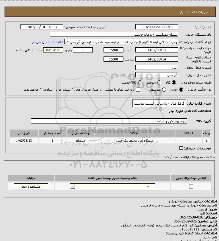 | 1 | -- | دستگاه فتال مانیتورینگ جنین | دستگاه | 1 | 1402/08/13 |