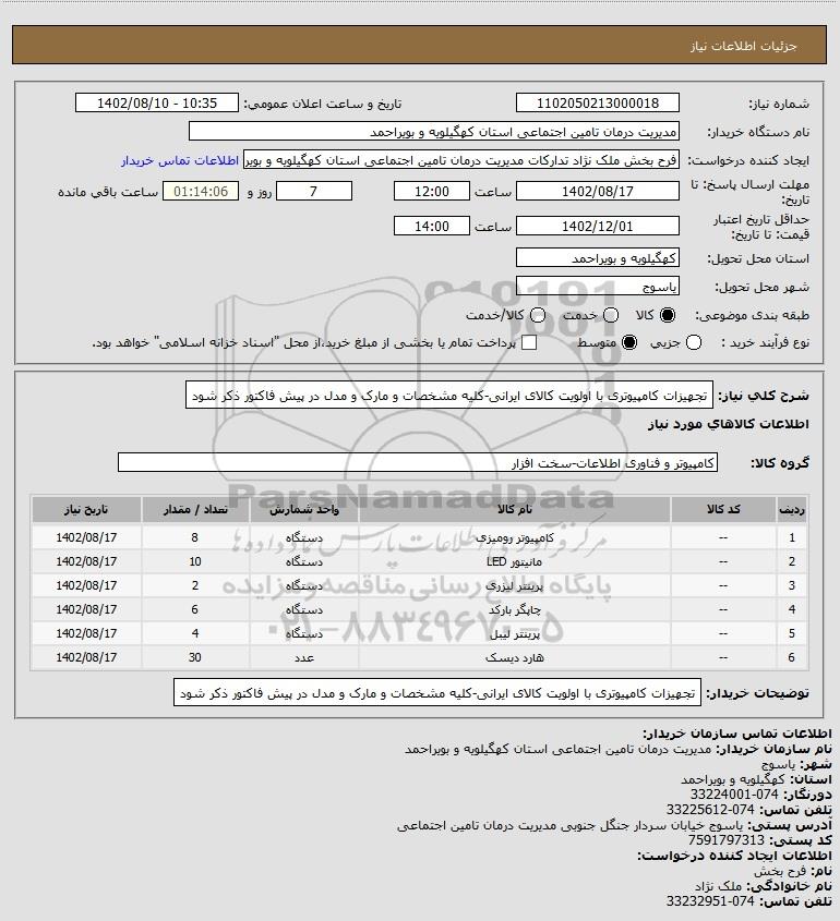 شرح کلی نیاز: تجهیزات کامپیوتری با اولویت کالای ایرانی-کلیه مشخصات و مارک و مدل در پیش فاکتور ذکر شود