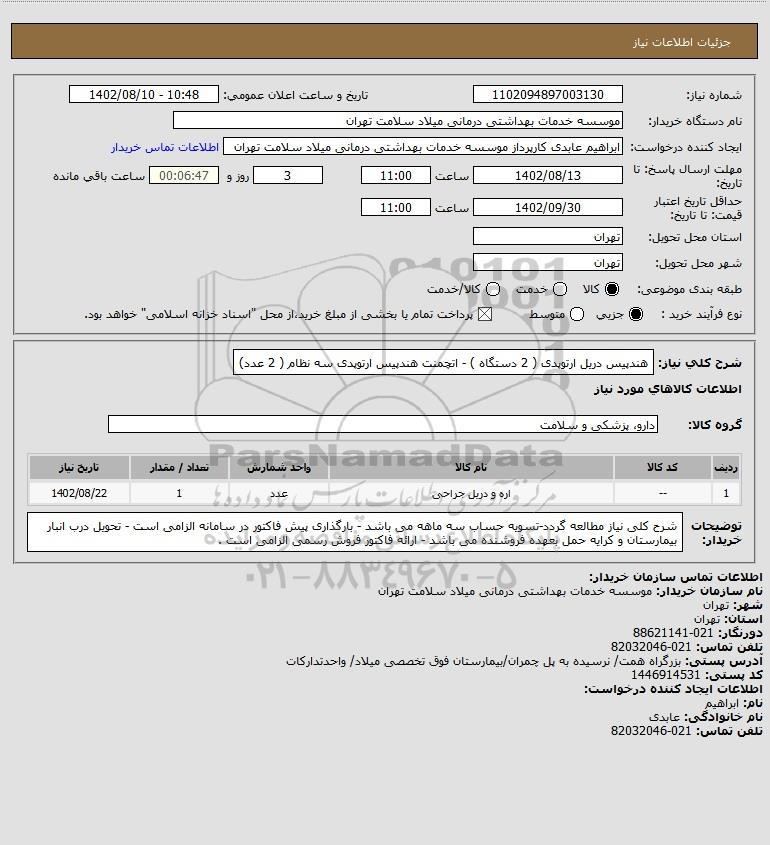 نام دستگاه خریدار:موسسه خدمات بهداشتی درمانی میلاد سلامت تهران