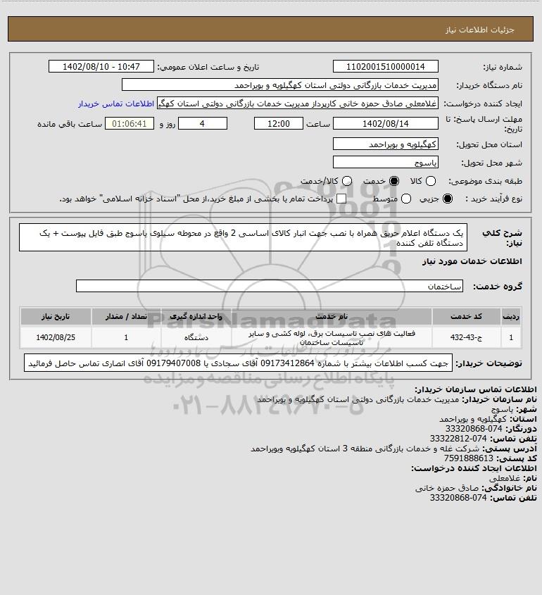 شرح کلی نیاز: یک دستگاه اعلام حریق همراه با نصب جهت انبار کالای اساسی 2 واقع در محوطه سیلوی یاسوج طبق فایل پیوست + یک دستگاه تلفن کننده