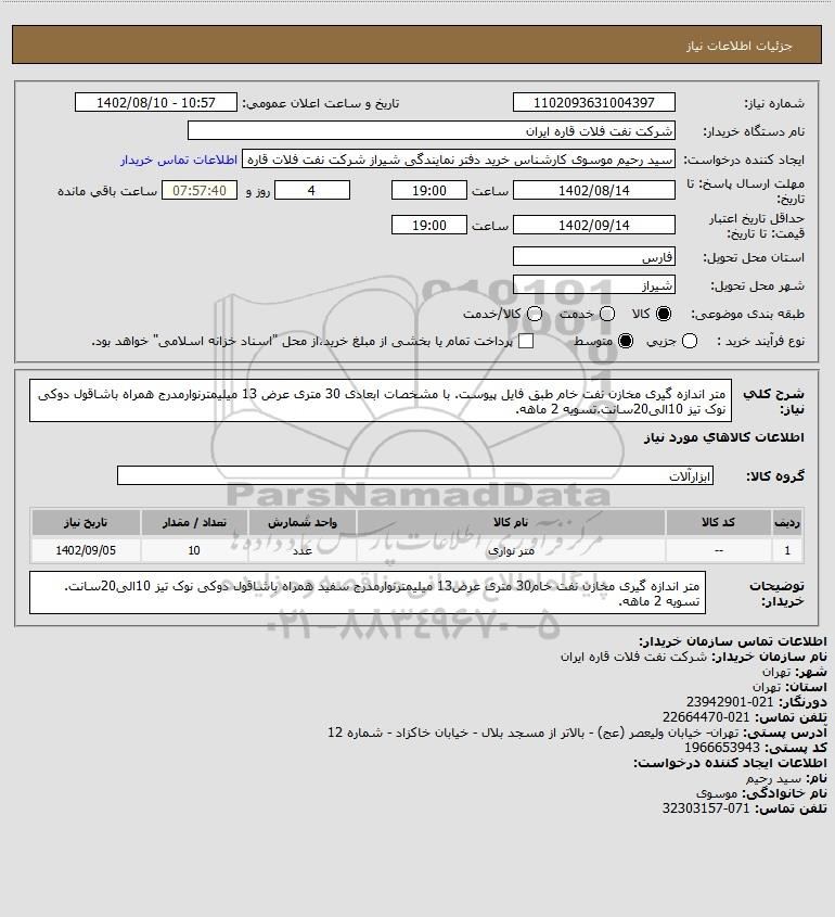 | 1 | -- | متر نواری | عدد | 10 | 1402/09/05 |