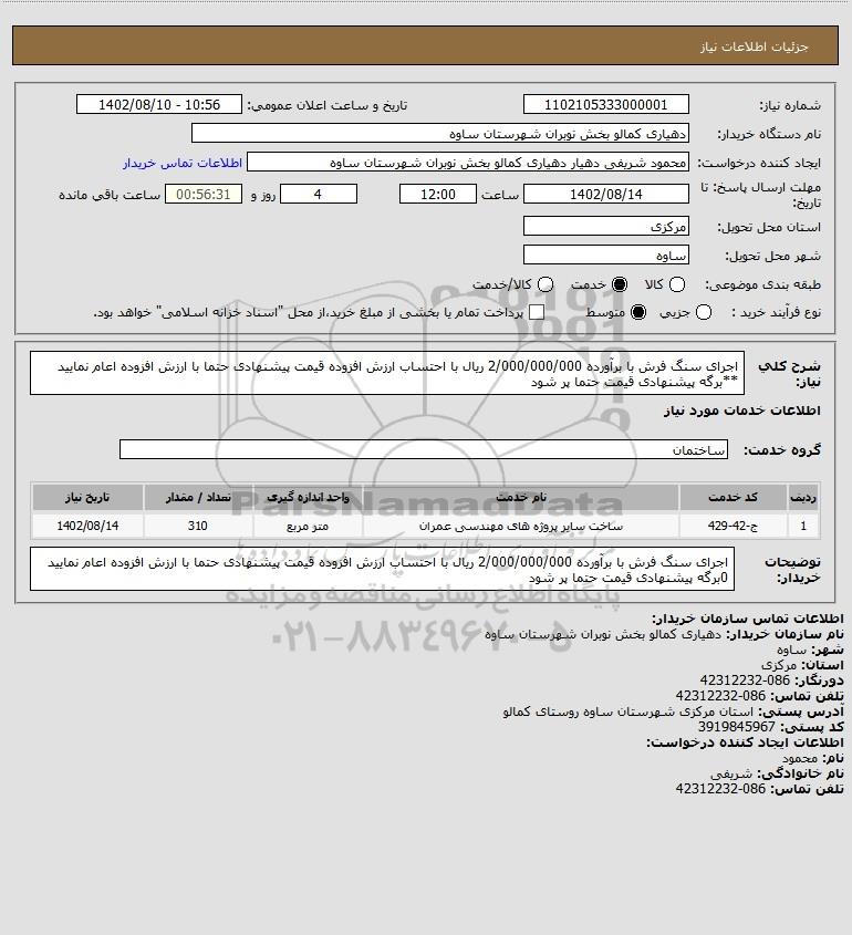 توضیحات خریدار:اجرای سنگ فرش با برآورده 2/000/000/000 ریال با احتساب ارزش افزوده