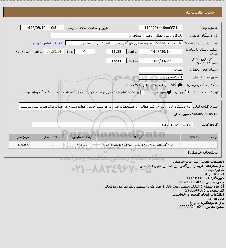 شرح کلی نیاز: دو دستگاه الایزر ریدر و واشر مطابق با مشخصات فنی درخواست خرید و موارد مندرج در جدول مشخصات فنی پیوست