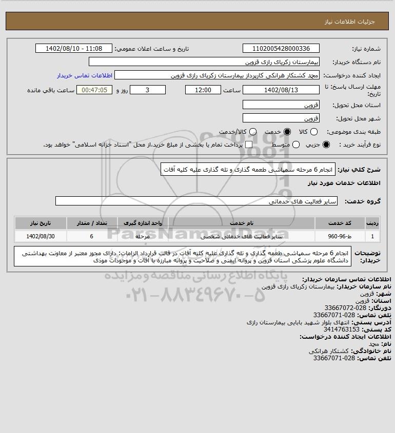 توضیحات خریدار:انجام 6 مرحله سمپاشی طعمه گذاری و تله گذاری علیه کلیه آفات در قالب قرارداد الزامات: دارای مجوز معتبر از معاونت بهداشتی دانشگاه علوم پزشکی استان قزوین و پروانه ایمنی و صلاحیت و پروانه مبارزه با آفات و موجودات موذی