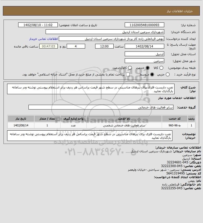 شرح کلی نیاز: نصب داربست فلزی برای بنرهای مناسبتی در سطح شهر قیمت براساس هر ردیف برابر استعلام پیوستی نوشته ودر سامانه بارگذاری نمایید