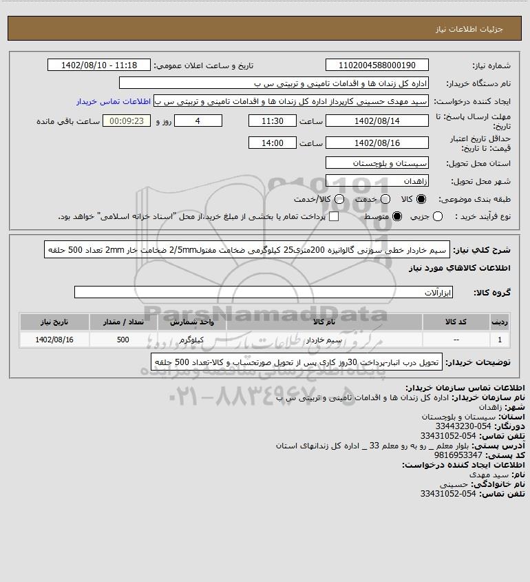 شرح کلی نیاز: سیم خاردار خطی سوزنی گالوانیزه 200متری25 کیلوگرمی ضخامت مفتول2/5mm ضخامت خار 2mm تعداد 500 حلقه
