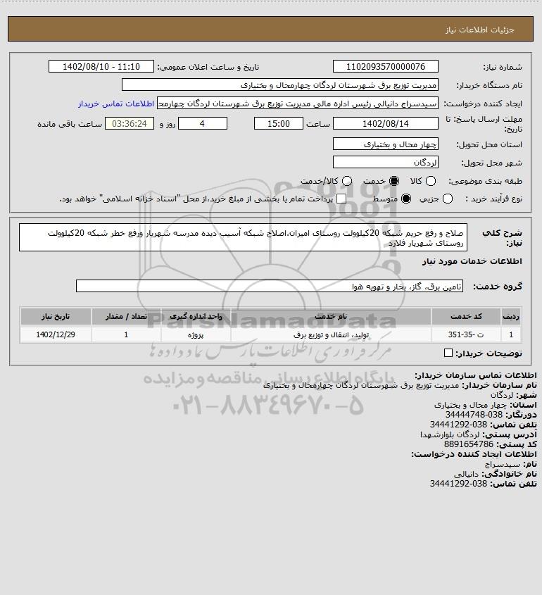 شرح کلی نیاز: صلاح و رفع حریم شبکه 20کیلوولت روستای امیران،اصلاح شبکه آسیب دیده مدرسه شهریار ورفع خطر شبکه 20کیلوولت روستای شهریار فلارد