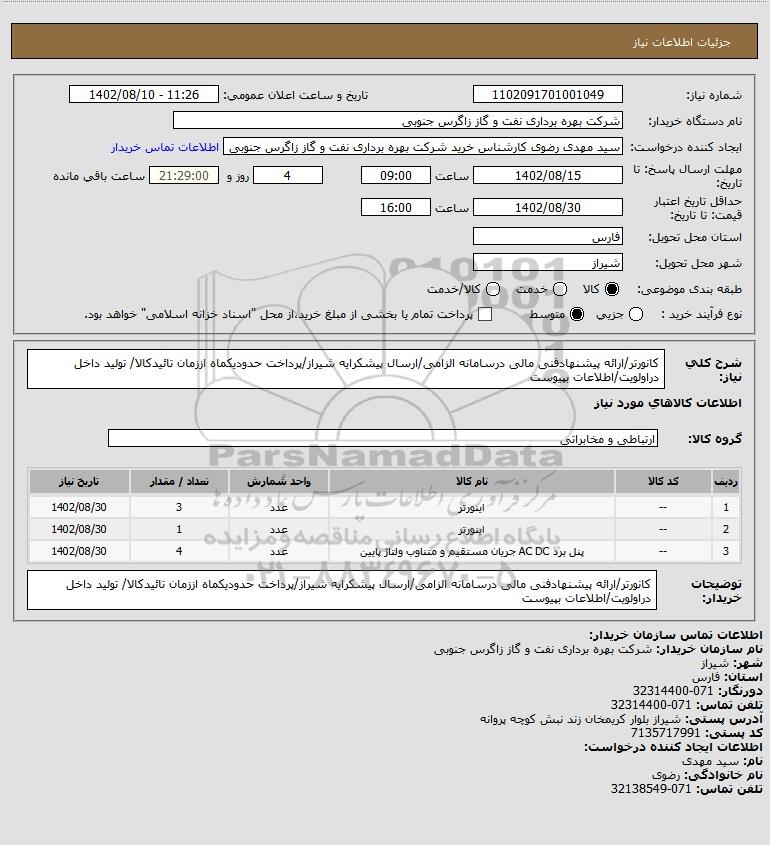 استعلام کانورتر/ارائه پیشنهادفنی مالی درسامانه الزامی/ارسال پیشکرایه شیراز/پرداخت حدودیکماه اززمان تائیدکالا/ تولید داخل دراولویت/اطلاعات بپیوست, استعلام کانورتر/ارائه پیشنهادفنی مالی درسامانه الزامی/ارسال پیشکرایه شیراز/پرداخت حدودیکماه اززمان تائیدکالا/ تولید داخل دراولویت/اطلاعات بپیوست