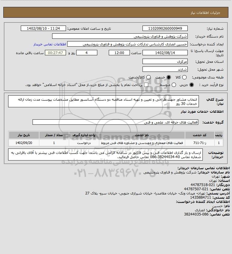 شرح کلی نیاز: انتخاب مشاور جهت طراحی و تعیین و تهیه اسناد مناقصه دو دستگاه آسانسور مطابق مشخصات پیوست مدت زمان ارائه خدمات 30 روز