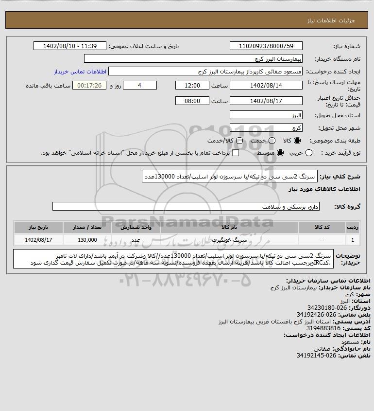 | 1 | -- | سرنگ خونگیری | عدد | 130,000 | 1402/08/17 |