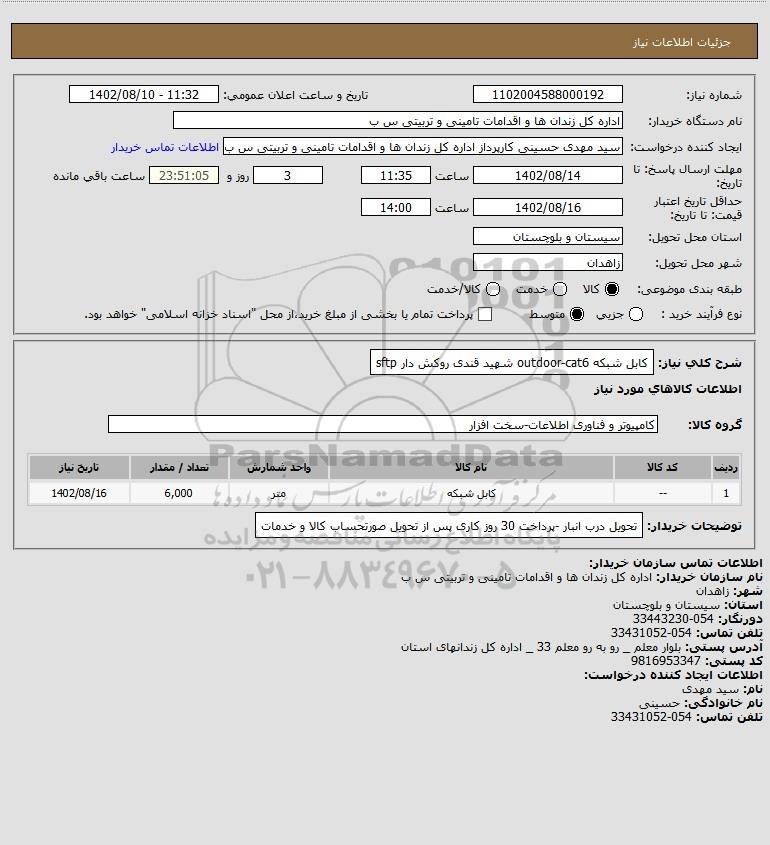 شرح کلی نیاز: کابل شبکه outdoor-cat6 شهید قندی روکش دار sftp