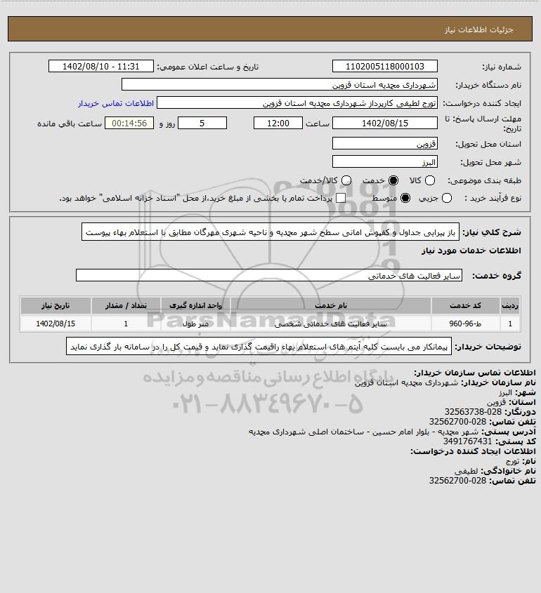 شرح کلی نیاز: باز پیرایی جداول و کفپوش امانی سطح شهر محمدیه و ناحیه شهری مهرگان مطابق با استعلام بهاء پیوست