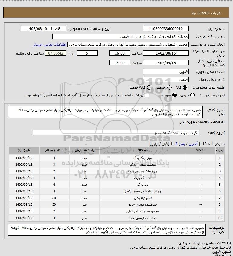 شرح کلی نیاز: تامین، ارسال و نصب وسایل بازیگاه کودکان پارک ولیعصر و سلامت و تابلوها و تجهیزات ترافیکی بلوار امام خمینی ره روستای کورانه از توابع بخش مرکزی قزوین