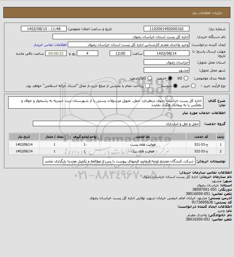 شرح کلی نیاز: اداره کل پست خراسان رضوی درنظردارد حمل، تحویل مرسولات پستی را از شهرستان تربت حیدریه به رشتخوار و خواف و بلعکس را به پیمانکار واگذار نمایدد