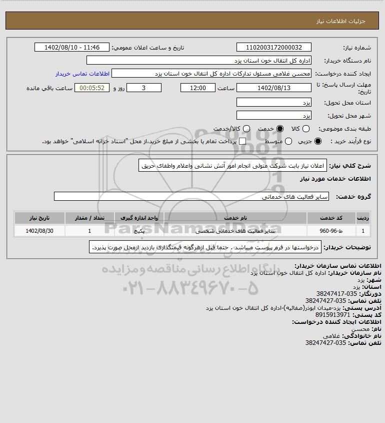 شرح کلی نیاز: اعلان نیاز بابت شرکت متولی انجام امور آتش نشانی واعلام واطفای حریق