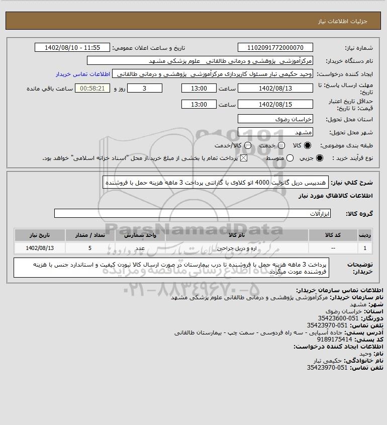 شرح کلی نیاز: هندپیس دریل گانولیت 4000 اتو کلاوی با گارانتی پرداخت 3 ماهه هزینه حمل با فروشنده