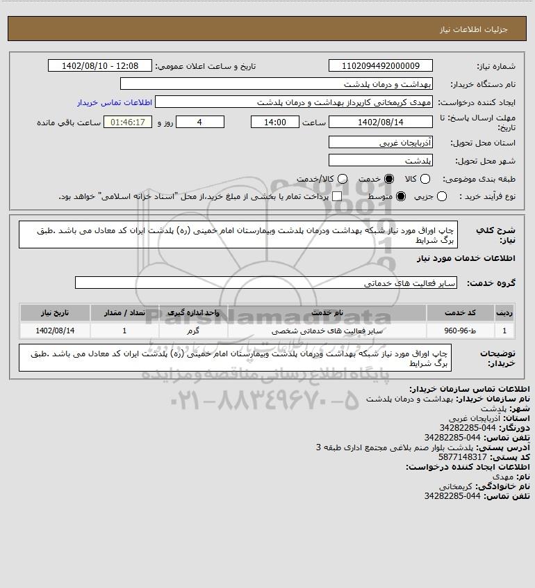 شرح کلی نیاز: چاپ اوراق مورد نیاز شبکه بهداشت ودرمان پلدشت وبیمارستان امام خمینی (ره) پلدشت ایران کد معادل می باشد .طبق برگ شرایط