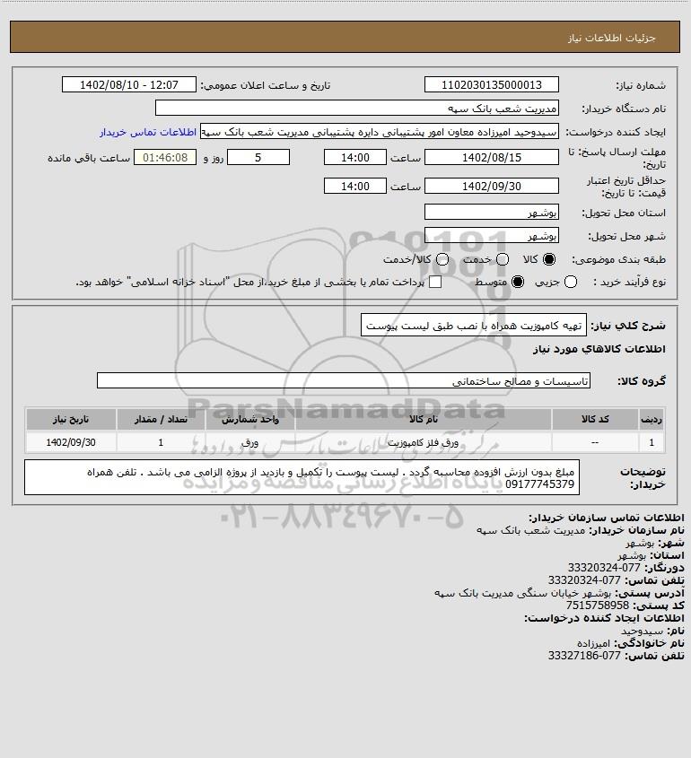 شرح کلی نیاز: تهیه کامپوزیت همراه با نصب طبق لیست پیوست