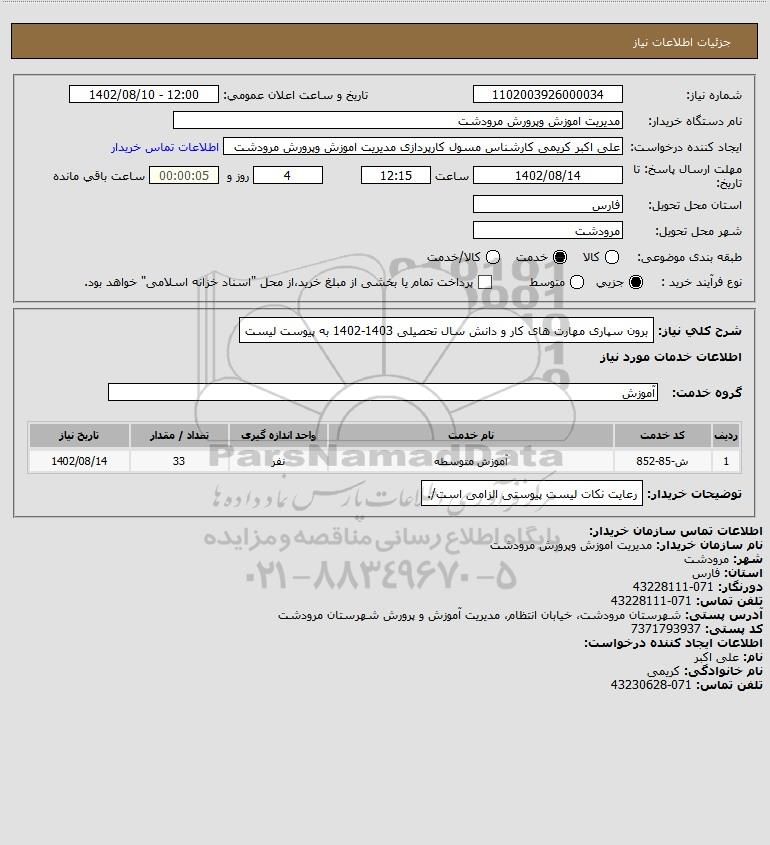 شرح کلی نیاز: برون سپاری مهارت های کار و دانش سال تحصیلی 1403-1402 به پیوست لیست