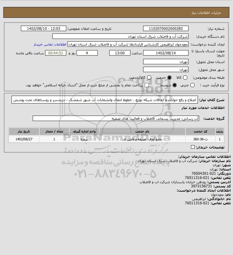 نام دستگاه خریدار:شرکت آب و فاضلاب شرق استان تهران