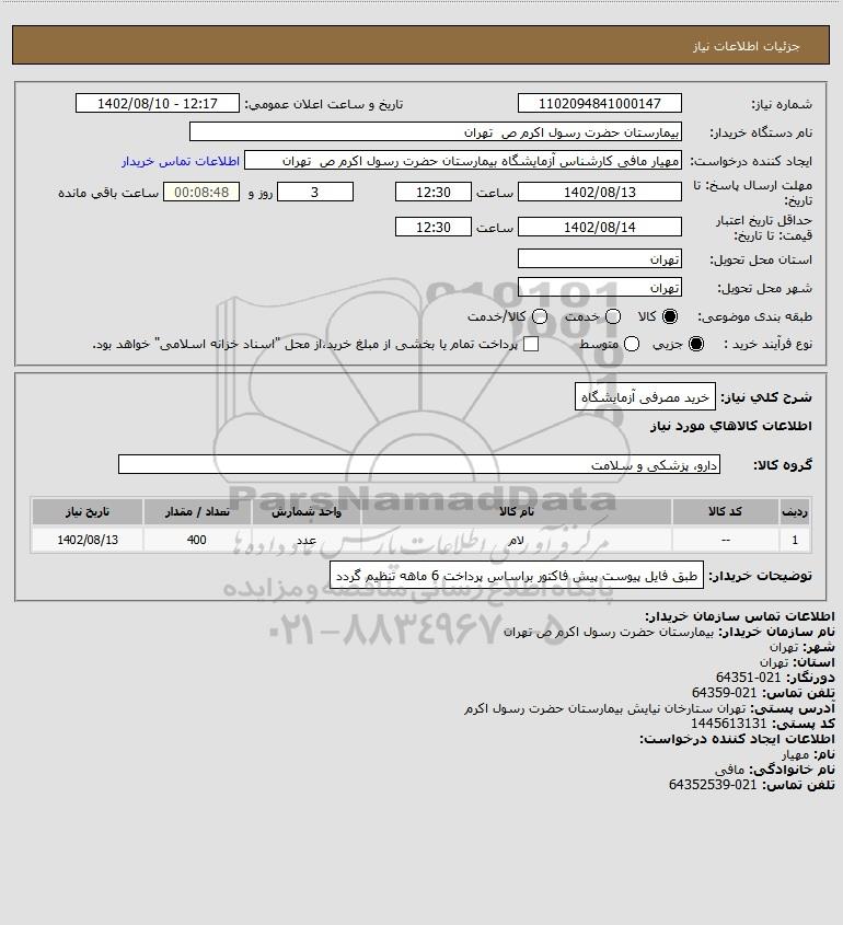 شرح کلی نیاز: خرید مصرفی آزمایشگاه